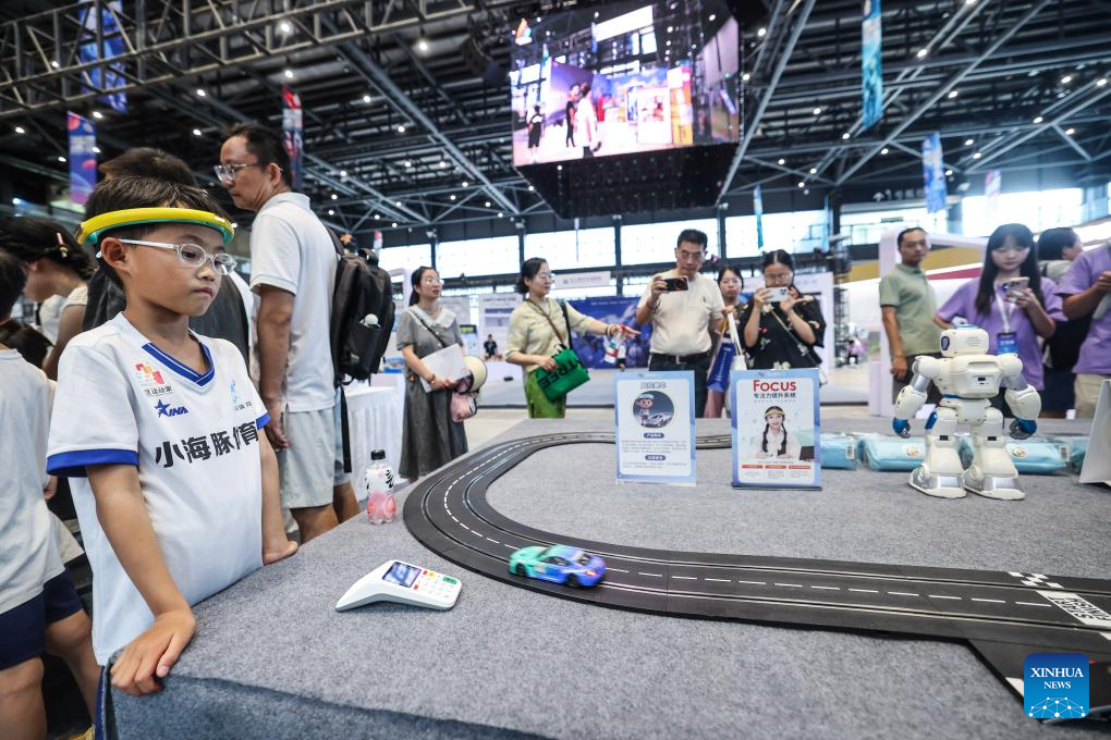 A boy experiences brain science technique at the Wuzhen Youth Tech Carnival in Wuzhen, east China's Zhejiang Province, on Aug. 17, 2025. The first Wuzhen Youth Tech Carnival is held from Aug. 15 to 25 in Wuzhen of Tongxiang City. This 11-day technology event, bringing together more than 40,000 young technology enthusiasts from all over the world, builds up a comprehensive platform for teenagers to show wisdom, boost innovation and touch the future. (Xinhua/Xu Yu)