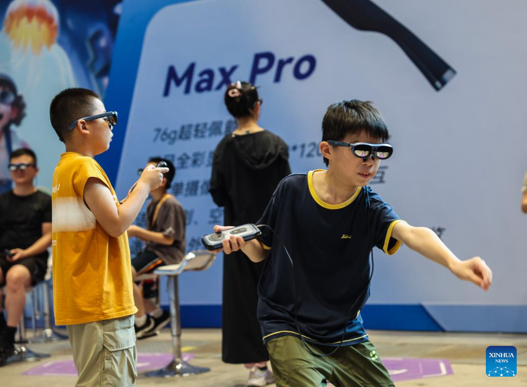 Children wearing VR glasses are pictured in a gesture recognition game at the Wuzhen Youth Tech Carnival in Wuzhen, east China's Zhejiang Province, on Aug. 17, 2025. The first Wuzhen Youth Tech Carnival is held from Aug. 15 to 25 in Wuzhen of Tongxiang City. This 11-day technology event, bringing together more than 40,000 young technology enthusiasts from all over the world, builds up a comprehensive platform for teenagers to show wisdom, boost innovation and touch the future. (Xinhua/Xu Yu)