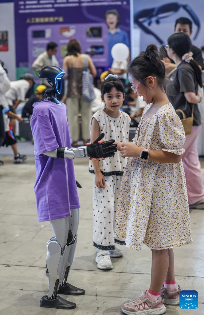 A Unitree humanoid robot interacts with children at the Wuzhen Youth Tech Carnival in Wuzhen, east China's Zhejiang Province, on Aug. 17, 2025. The first Wuzhen Youth Tech Carnival is held from Aug. 15 to 25 in Wuzhen of Tongxiang City. This 11-day technology event, bringing together more than 40,000 young technology enthusiasts from all over the world, builds up a comprehensive platform for teenagers to show wisdom, boost innovation and touch the future. (Xinhua/Xu Yu)