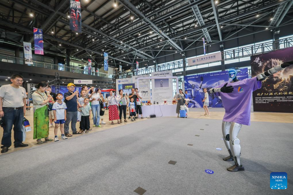 A Unitree humanoid robot dances for the audience at the Wuzhen Youth Tech Carnival in Wuzhen, east China's Zhejiang Province, on Aug. 17, 2025. The first Wuzhen Youth Tech Carnival is held from Aug. 15 to 25 in Wuzhen of Tongxiang City. This 11-day technology event, bringing together more than 40,000 young technology enthusiasts from all over the world, builds up a comprehensive platform for teenagers to show wisdom, boost innovation and touch the future. (Xinhua/Xu Yu)