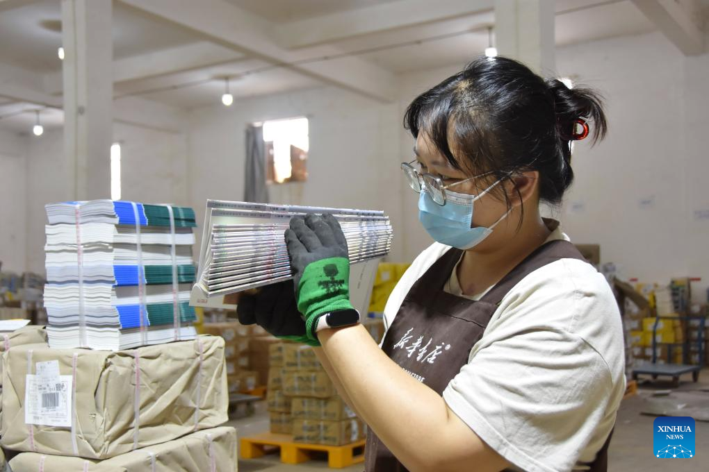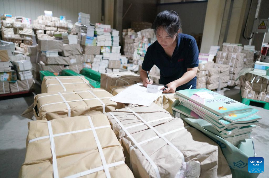 A staff member registers and sorts out textbooks for the upcoming new semester at a warehouse in Linyi City, east China's Shandong Province, Aug. 16, 2025. Schools and bookstores across the country are getting textbooks ready for the upcoming new semester. (Photo by Yin Jun/Xinhua)
