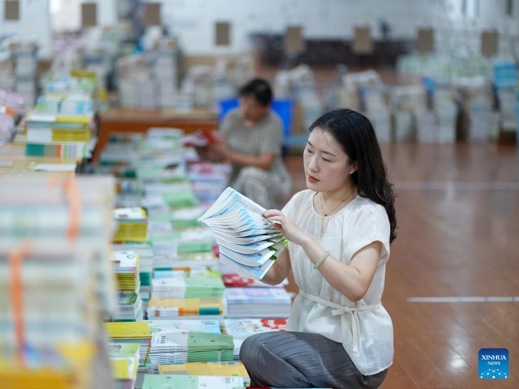 Faculty members sort out textbooks for the upcoming new semester at a school in Xinghua City, east China's Jiangsu Province, Aug. 16, 2025. Schools and bookstores across the country are getting textbooks ready for the upcoming new semester. (Photo by Zhou Shegen/Xinhua)