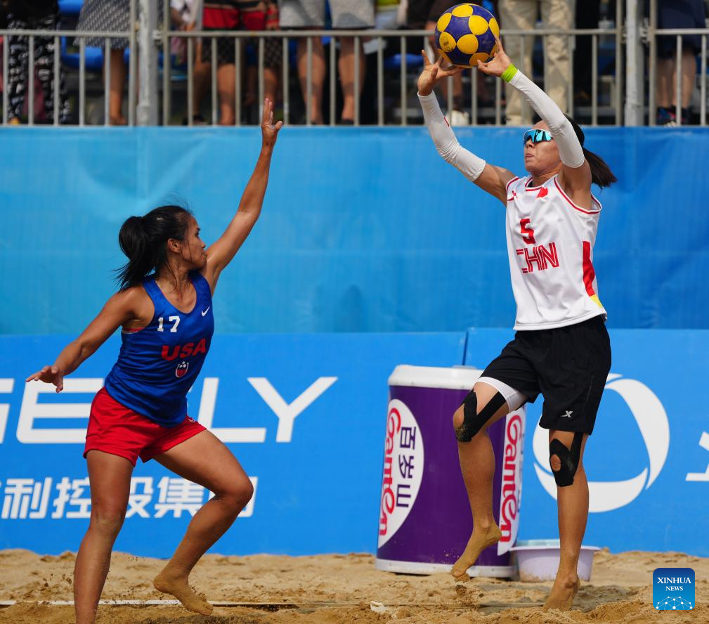 Niu Hui (R) of China competes during the Beach Korfball Mixed Team Preliminary Round Group B Game between China and the United States at The World Games 2025 in Chengdu, southwest China's Sichuan Province, Aug. 16, 2025. (Xinhua/Chen Xinbo)