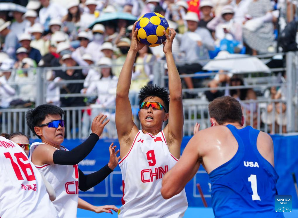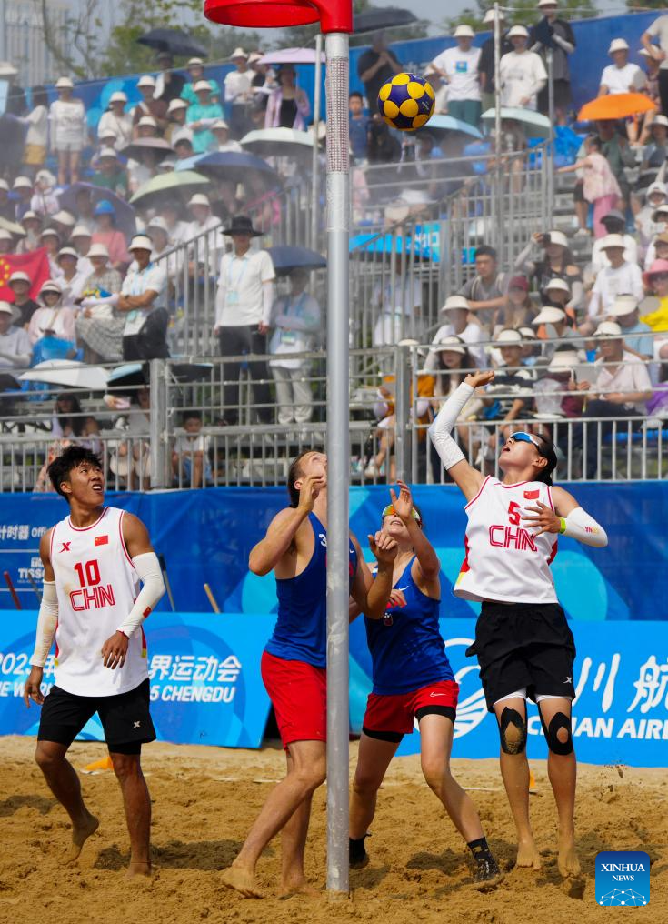 He Linxu (2nd R) of China competes during the Beach Korfball Mixed Team Preliminary Round Group B Game between China and the United States at The World Games 2025 in Chengdu, southwest China's Sichuan Province, Aug. 16, 2025. (Xinhua/Chen Xinbo)