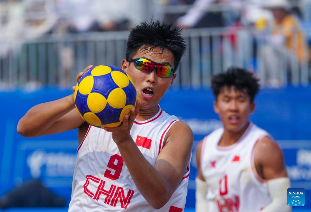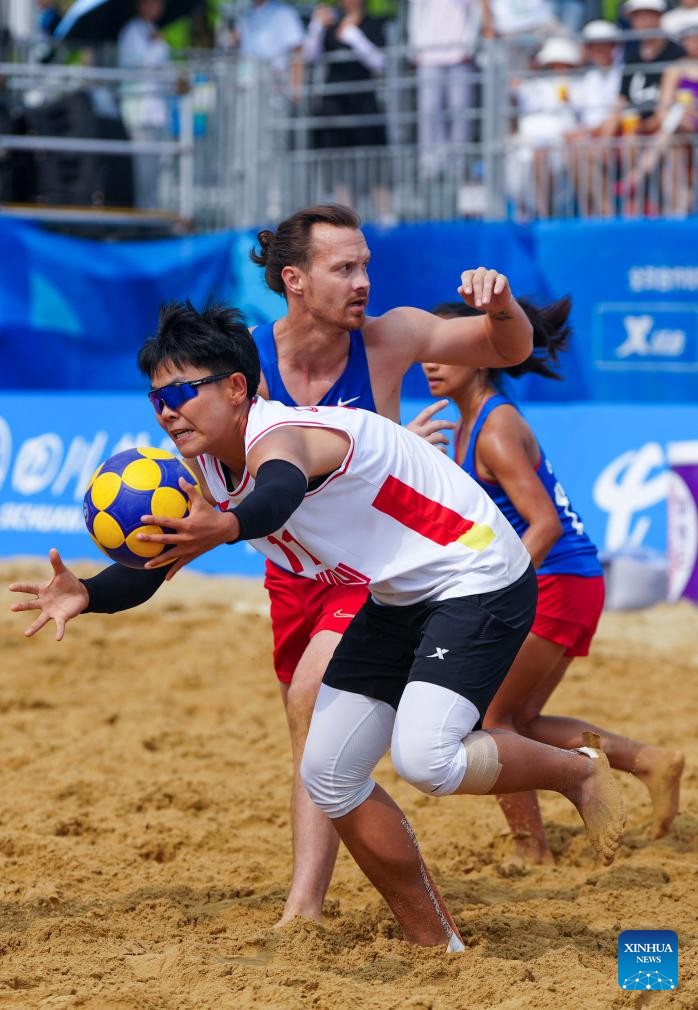 He Linxu of China competes during the Beach Korfball Mixed Team Preliminary Round Group B Game between China and the United States at The World Games 2025 in Chengdu, southwest China's Sichuan Province, Aug. 16, 2025. (Xinhua/Chen Xinbo)