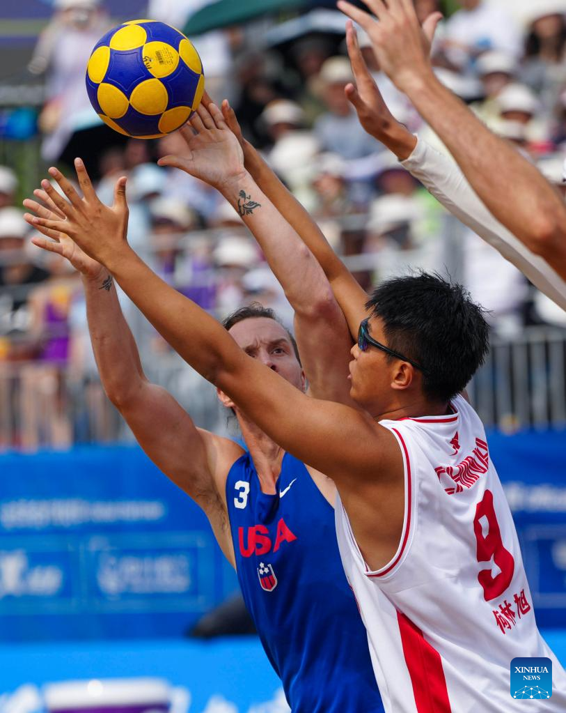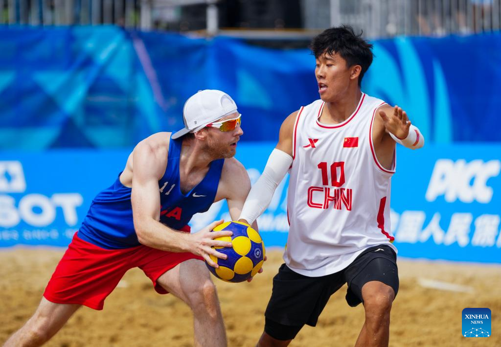 He Linxu (R) of China vies with Sean Hermes of the United States during the Beach Korfball Mixed Team Preliminary Round Group B Game between China and the United States at The World Games 2025 in Chengdu, southwest China's Sichuan Province, Aug. 16, 2025. (Xinhua/Chen Xinbo)