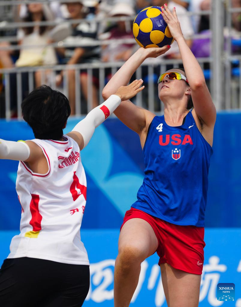Lindsey Cleary (R) of the United States competes during the Beach Korfball Mixed Team Preliminary Round Group B Game between China and the United States at The World Games 2025 in Chengdu, southwest China's Sichuan Province, Aug. 16, 2025. (Xinhua/Chen Xinbo)