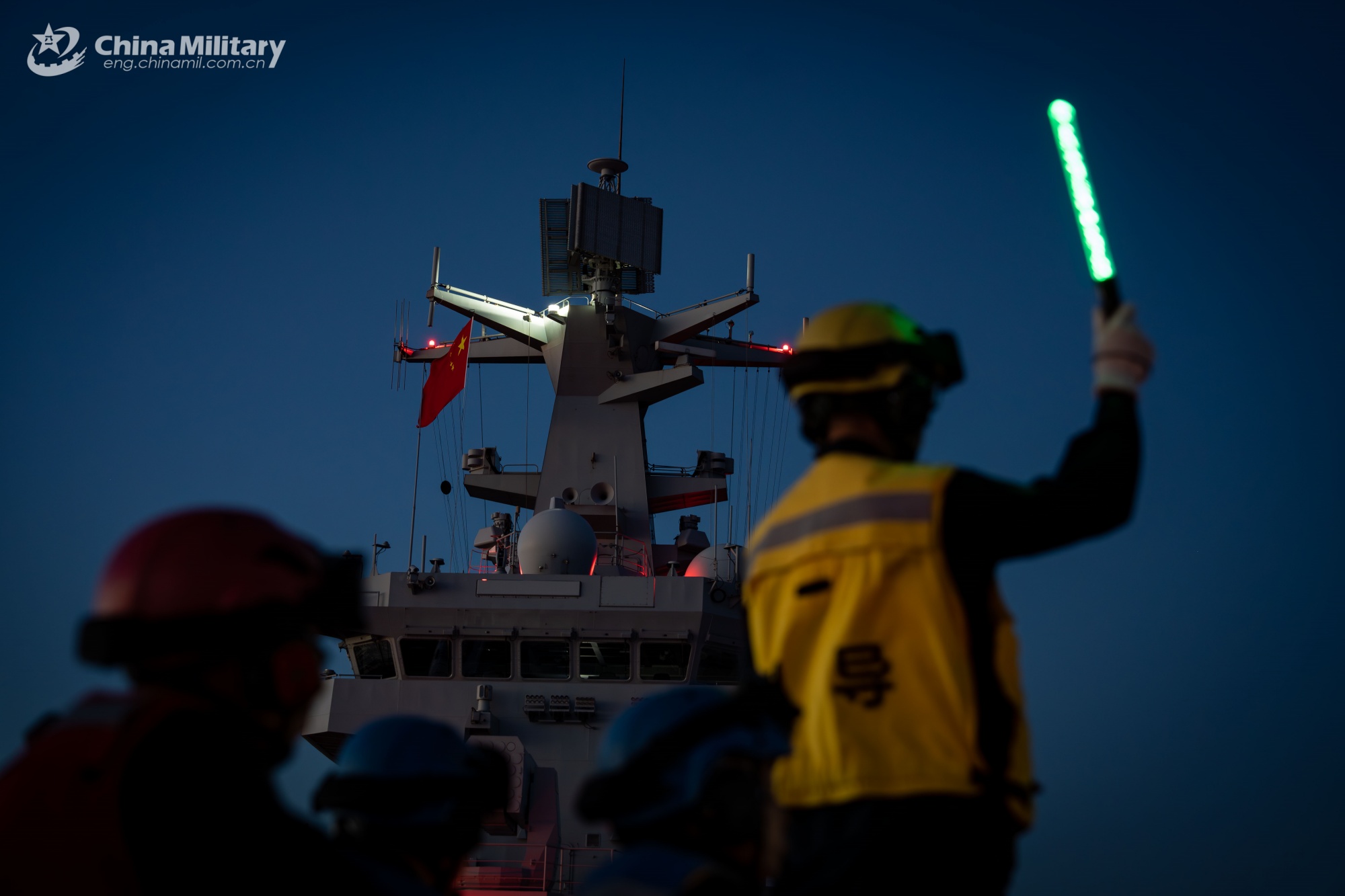 A crew member assigned to a detachment under the Chinese PLA Navy signals a ship-borne helicopter during a nighttime takeoff and landing training exercise. (eng.chinamil.com.cn/Photo by Sun Xitao)