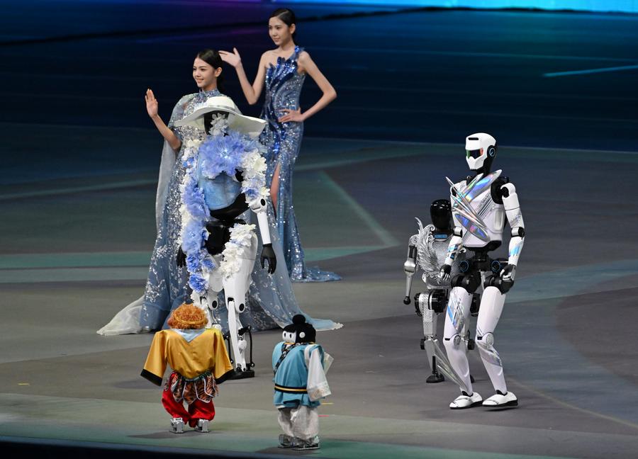 Dressed-up humanoid robots perform a fashion show during the opening ceremony of The 2025 World Humanoid Robot Games in Beijing, capital of China, Aug. 14, 2025. (Xinhua/Zhang Chenlin)