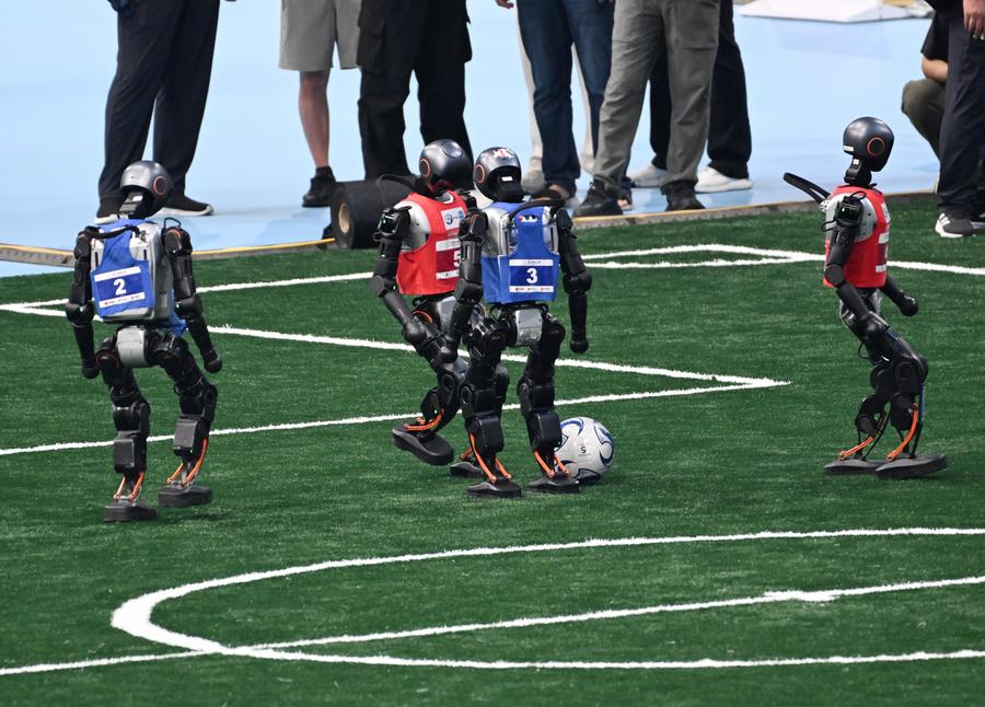 Humanoid robots play football during the opening ceremony of The 2025 World Humanoid Robot Games in Beijing, capital of China, Aug. 14, 2025. (Xinhua/Zhang Chenlin)
