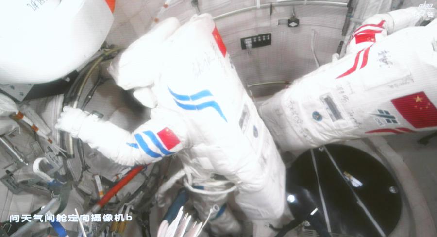 This screen image captured at Beijing Aerospace Control Center on Aug. 15, 2025 shows Shenzhou-20 taikonauts Chen Dong (L) and Wang Jie preparing to leave China's orbiting space station for extravehicular activities. (Xinhua/Li Yanchen)