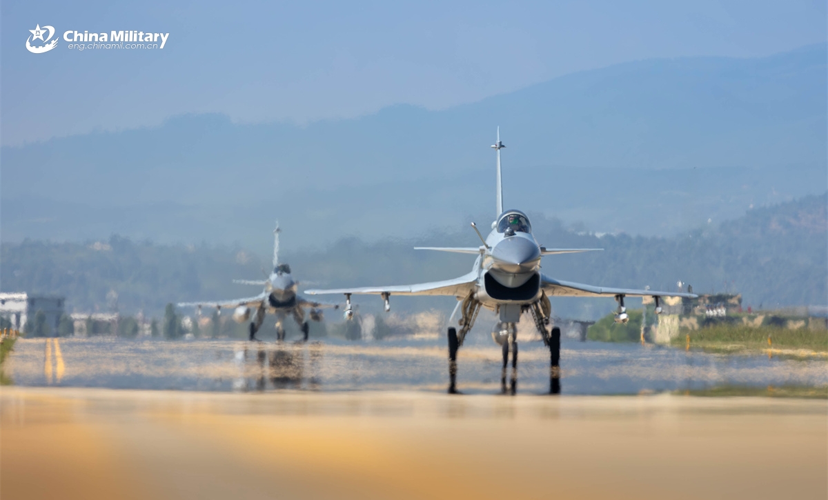J-10 fighter jets attached to the Chinese PLA Air Force taxi on the runway during an air-combat training exercise. (eng.chinamil.com.cn/Photo by Wang Wen and Lan Shanhu)