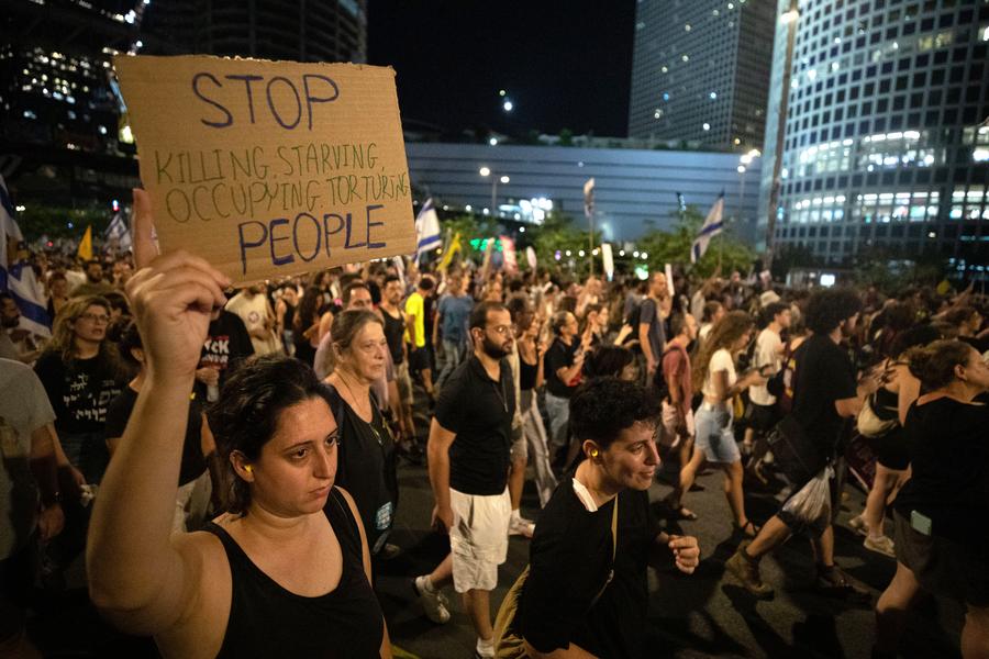 People take part in a rally in Tel Aviv, Israel, Aug. 17, 2025. (Xinhua/Chen Junqing)