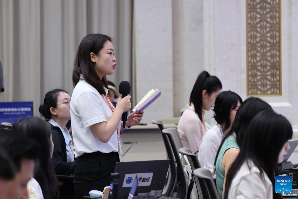 A journalist asks a question at a press conference held by the State Council Information Office (SCIO) on China's achievements in building a leading country in sport during the 14th Five-Year Plan period (2021-2025) in Beijing, capital of China, Aug. 19, 2025. (Xinhua/Jin Liwang)