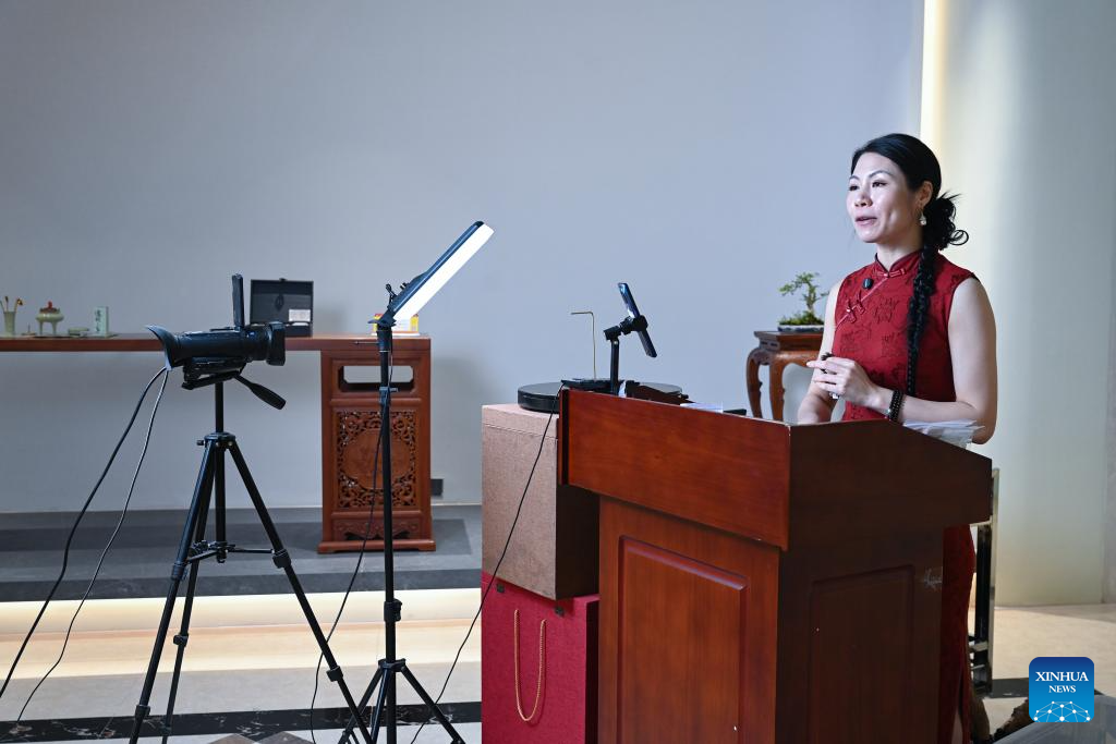 A host introduces products through live-streaming at Sanfu art gallery in Xianyou County, Putian City, southeast China's Fujian Province, Aug. 18, 2025. In recent years, Xianyou County has promoted the upgrading and transformation of traditional art and crafts industry, establishing four major product categories which include high-end collections, fine home decoration, new Chinese-style light luxury, and cultural and creative small items. It has also accelerated its overseas market layout through e-commerce live-streaming. (Xinhua/Zhou Yi)