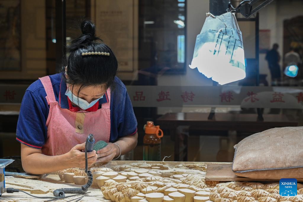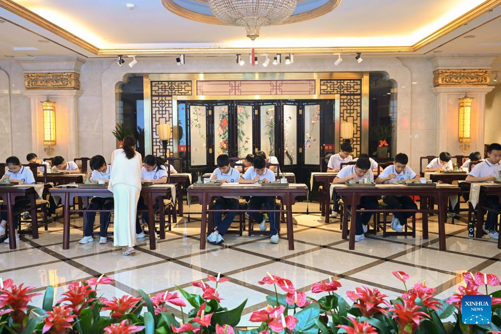 Students experience traditional Chinese handicraft at Sanfu art gallery in Xianyou County, Putian City, southeast China's Fujian Province, Aug. 18, 2025. In recent years, Xianyou County has promoted the upgrading and transformation of traditional art and crafts industry, establishing four major product categories which include high-end collections, fine home decoration, new Chinese-style light luxury, and cultural and creative small items. It has also accelerated its overseas market layout through e-commerce live-streaming. (Xinhua/Zhou Yi)