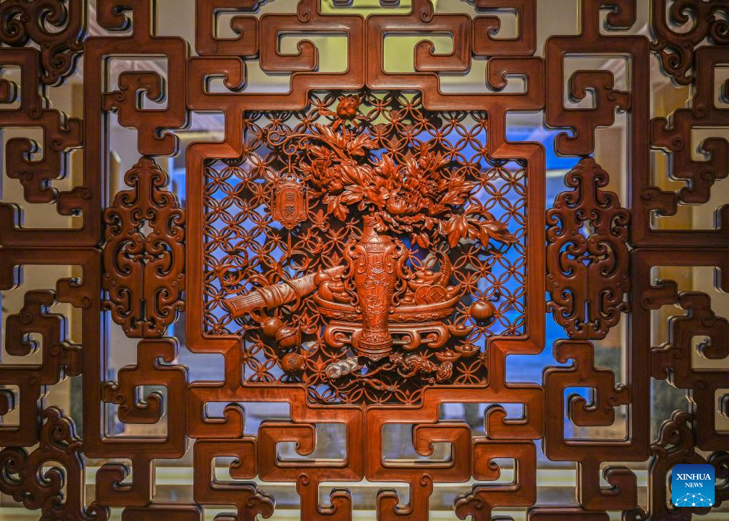 This photo taken on Aug. 18, 2025 shows a piece of wooden handicraft at Fujian Sanfu Classical Furniture Co., Ltd. in Xianyou County, Putian City, southeast China's Fujian Province. In recent years, Xianyou County has promoted the upgrading and transformation of traditional art and crafts industry, establishing four major product categories which include high-end collections, fine home decoration, new Chinese-style light luxury, and cultural and creative small items. It has also accelerated its overseas market layout through e-commerce live-streaming. (Xinhua/Zhou Yi)