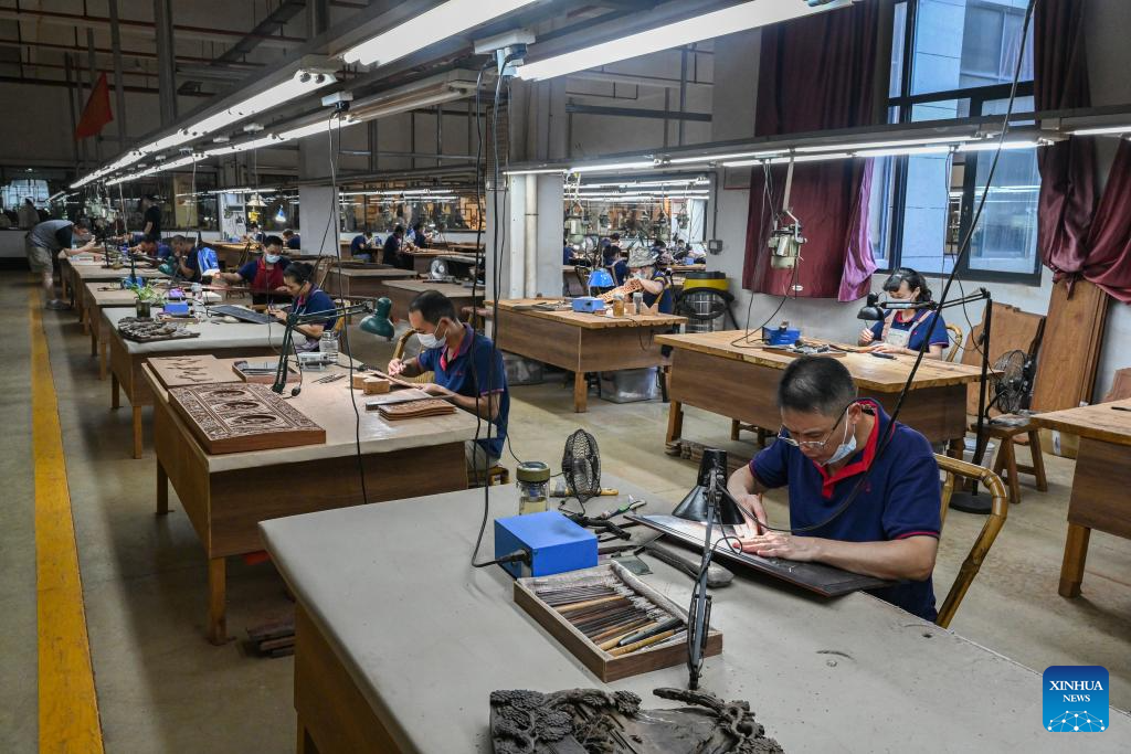 Workers carve handicrafts at Fujian Sanfu Classical Furniture Co., Ltd. in Xianyou County, Putian City, southeast China's Fujian Province, Aug. 18, 2025. In recent years, Xianyou County has promoted the upgrading and transformation of traditional art and crafts industry, establishing four major product categories which include high-end collections, fine home decoration, new Chinese-style light luxury, and cultural and creative small items. It has also accelerated its overseas market layout through e-commerce live-streaming. (Xinhua/Zhou Yi)