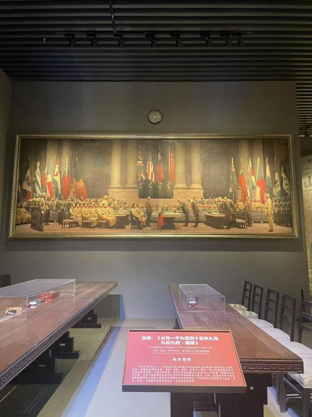 An oil painting at Museum of the War of Chinese People's Resistance Against Japanese Aggression shows the ceremony for Japan's surrender held in Nanjing on Sept. 9, 1945. (Photo by Pedro Loeher)