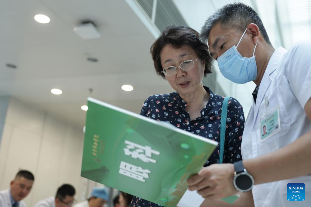 A woman registers during a free clinic event at Peking Union Medical College Hospital (Dongdan campus) in Beijing, capital of China, Aug. 19, 2025. Peking Union Medical College Hospital (PUMCH) held a free clinic event here on Tuesday to mark the eighth Doctors' Day. More than 50 medical staff representatives provided on-site health consultations to patients. Meanwhile, hospital volunteers drew personalized cartoon pictures for the participating medical personnel.