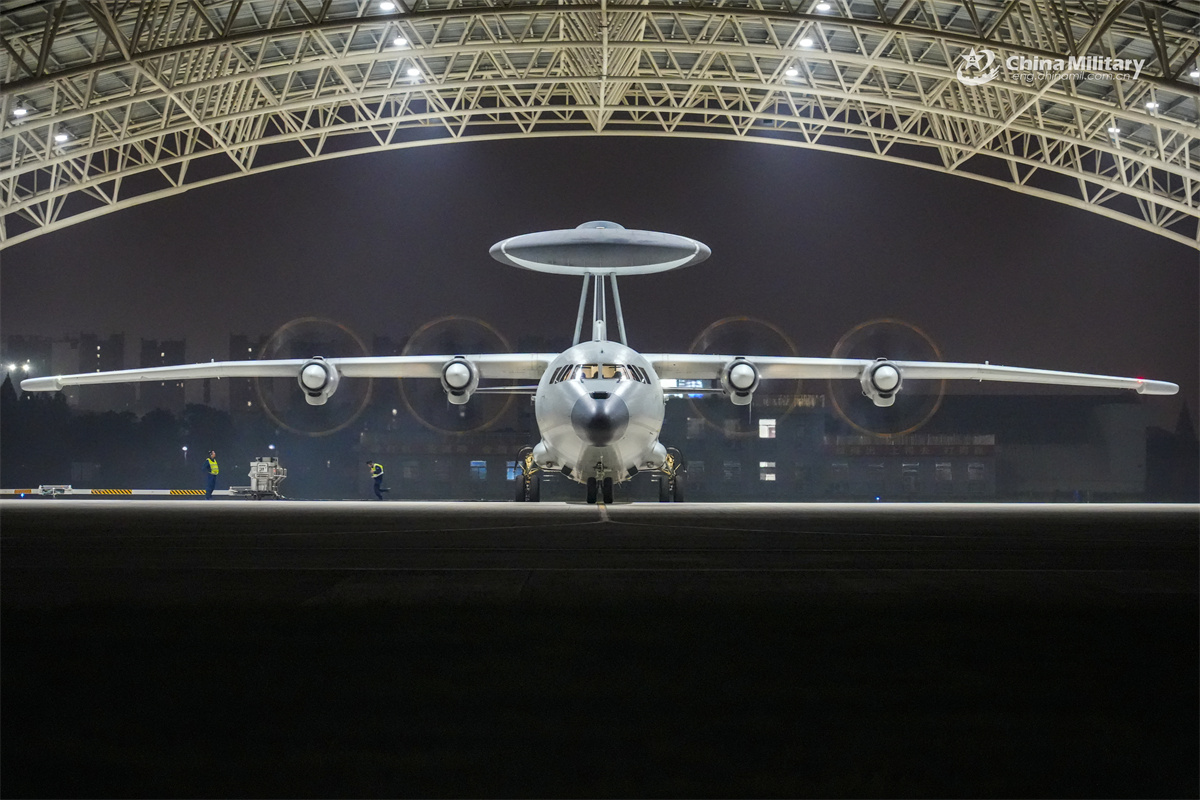KJ-500H airborne early warning aircraft attached to an aviation unit under the Chinese PLA Navy gets ready for a night flight training exercise on August 4, 2025. (eng.chinamil.com.cn/Photo by Hao Yongfei)