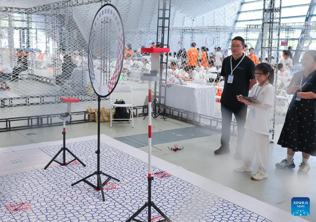 A contestant is pictured in a UAV themed competition during the finals of the China Youth Electronic &Information Literacy Contest in Tongxiang City, east China's Zhejiang Province, Aug. 20, 2025. The finals of the contest kicked off here on Tuesday and will last until Aug. 24. More than 28,000 contestants nationwide will compete in 20 events in three major fields including intelligent application, algorithmic thinking, and independent innovation. (Xinhua/Xu Yu)