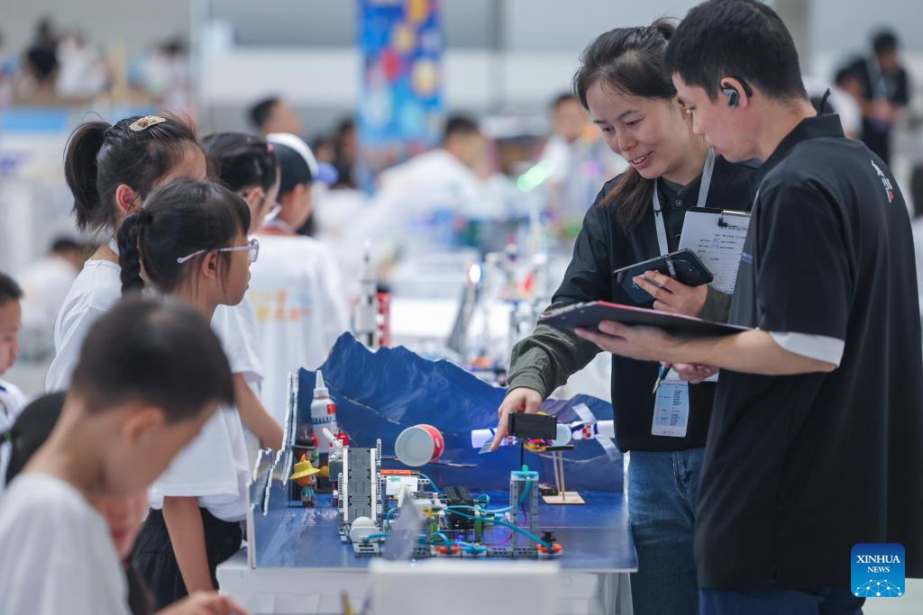 Contestants are pictured in a "survival on Mars" challenge competition during the finals of the China Youth Electronic &Information Literacy Contest in Tongxiang City, east China's Zhejiang Province, Aug. 20, 2025. The finals of the contest kicked off here on Tuesday and will last until Aug. 24. More than 28,000 contestants nationwide will compete in 20 events in three major fields including intelligent application, algorithmic thinking, and independent innovation. (Xinhua/Xu Yu)