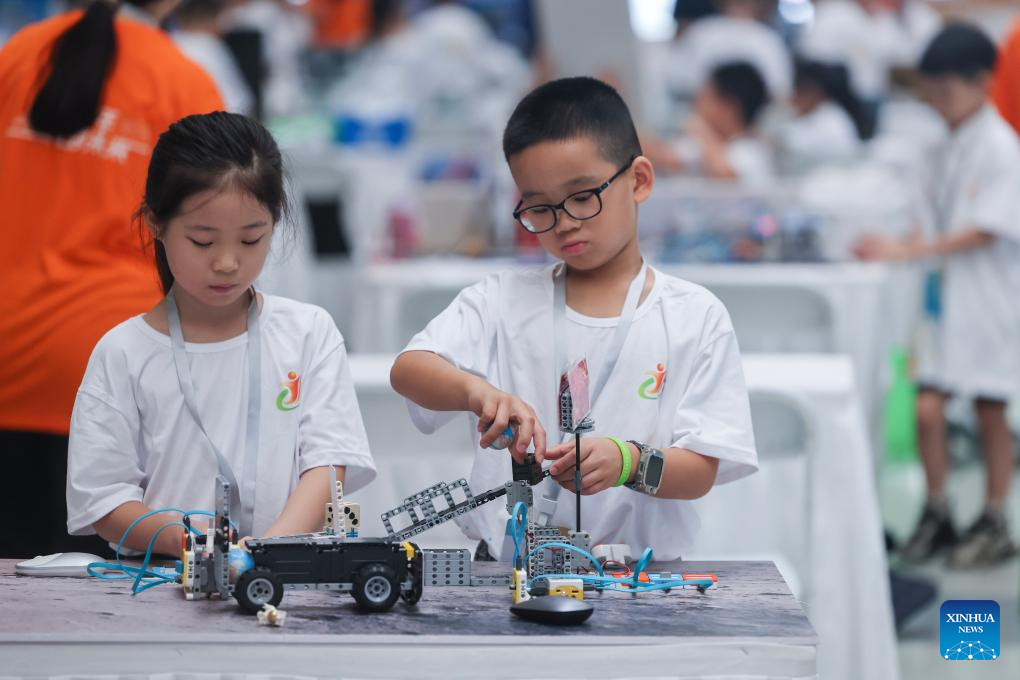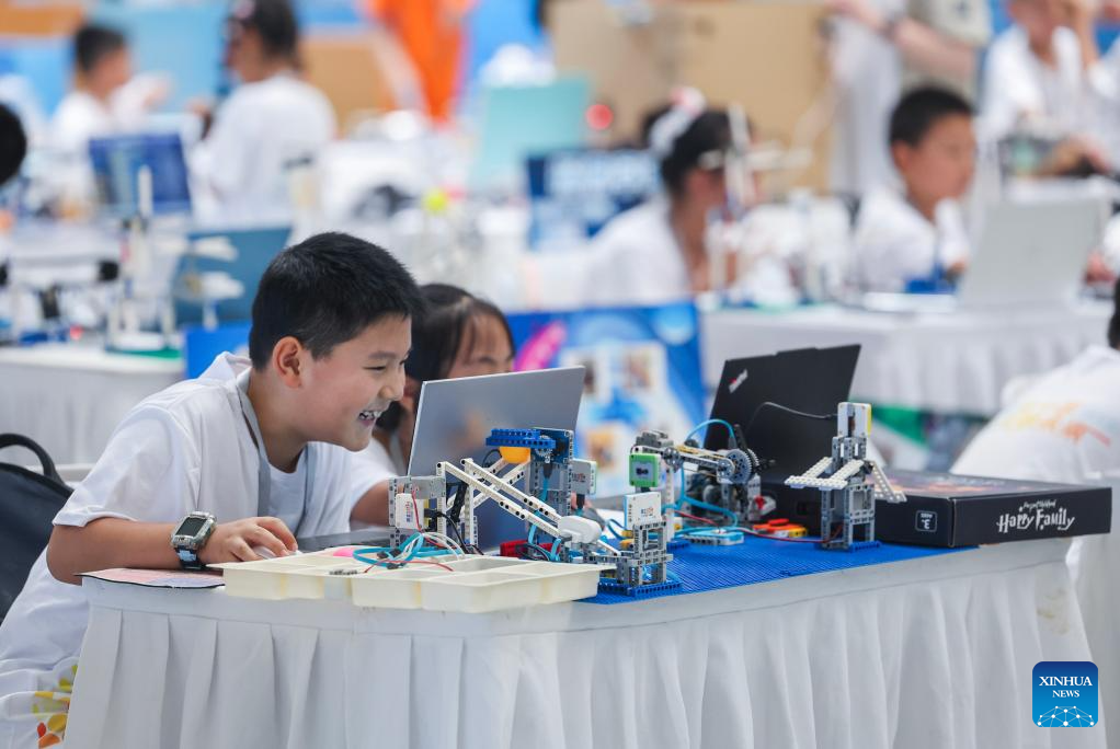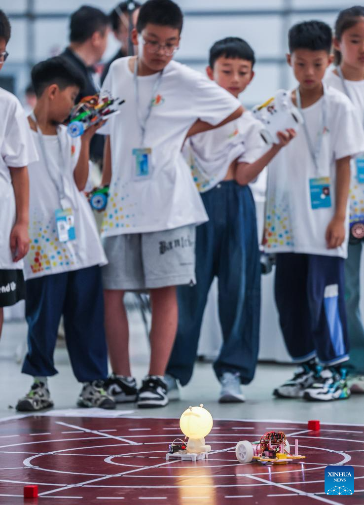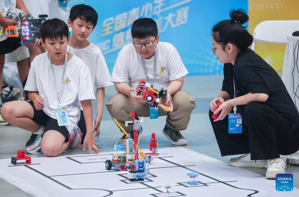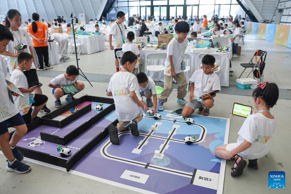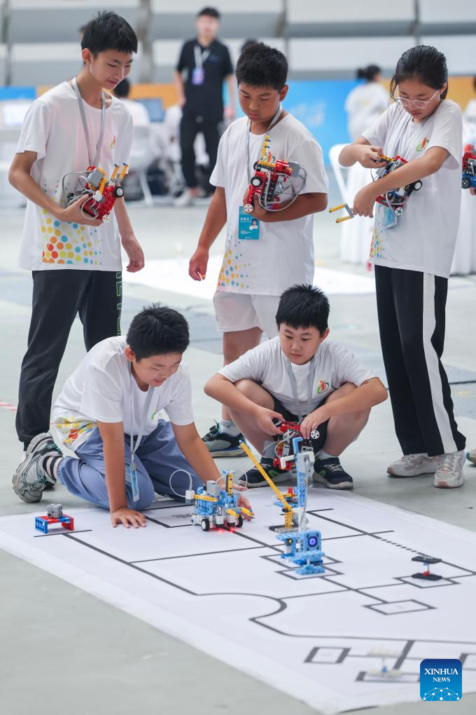 Contestants are pictured in a "smart planet" challenge competition during the finals of the China Youth Electronic &Information Literacy Contest in Tongxiang City, east China's Zhejiang Province, Aug. 20, 2025. The finals of the contest kicked off here on Tuesday and will last until Aug. 24. More than 28,000 contestants nationwide will compete in 20 events in three major fields including intelligent application, algorithmic thinking, and independent innovation. (Xinhua/Xu Yu)