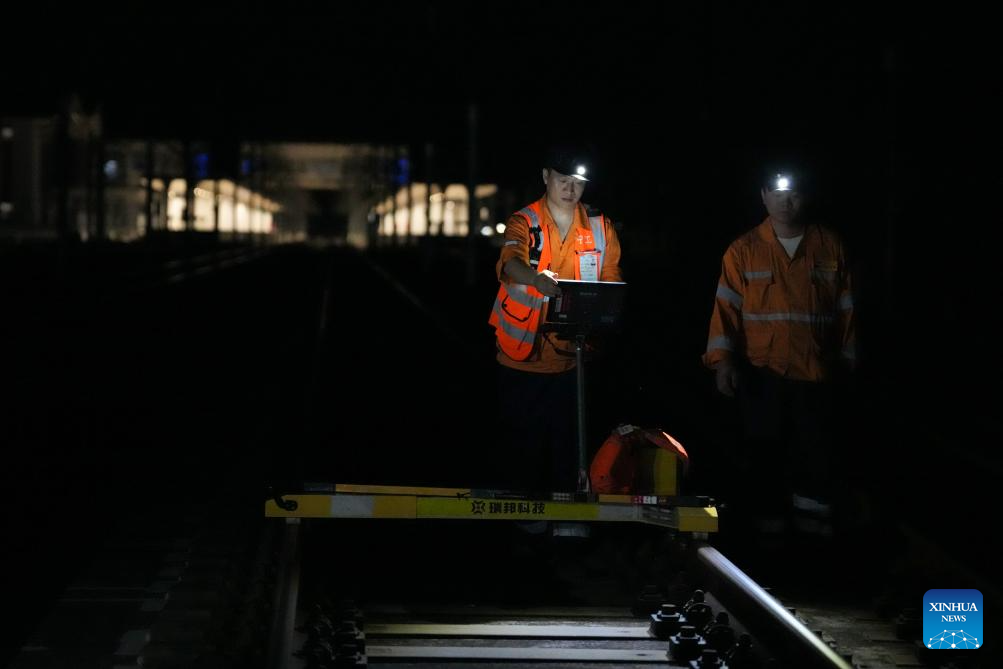 Staff members operate a track inspection instrument to examine the Hangzhou-Shaoxing-Taizhou intercity railway in east China's Zhejiang Province on early Aug. 20, 2025. Staff members inspected and maintained several systems of the railway on early Wednesday to ensure the stable operation of the Hangzhou-Shaoxing-Taizhou intercity railway.
