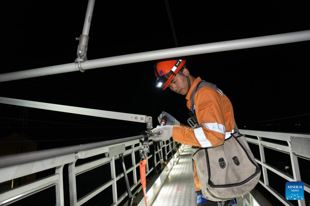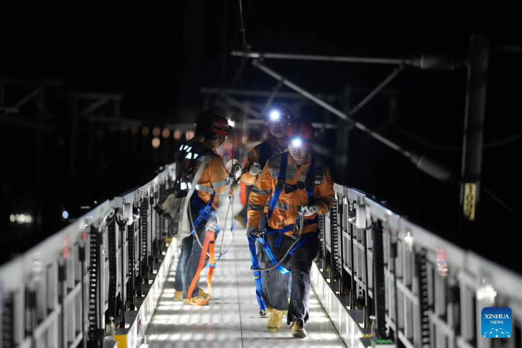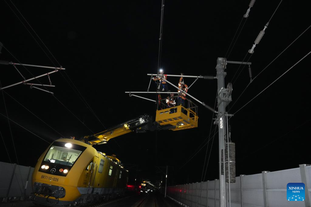 Staff members on a multifunctional operation vehicle inspect the power supply equipment of Hangzhou-Shaoxing-Taizhou intercity railway in east China's Zhejiang Province on early Aug. 20, 2025. Staff members inspected and maintained several systems of the railway on early Wednesday to ensure the stable operation of the Hangzhou-Shaoxing-Taizhou intercity railway.