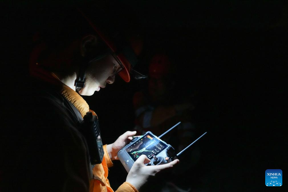 A staff member controls a drone to inspect the Hangzhou-Shaoxing-Taizhou intercity railway in east China's Zhejiang Province on early Aug. 20, 2025. Staff members inspected and maintained several systems of the railway on early Wednesday to ensure the stable operation of the Hangzhou-Shaoxing-Taizhou intercity railway.