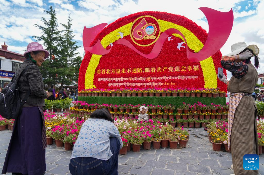 A child poses for photos at a floral installation in Lhasa, southwest China's Xizang Autonomous Region, Aug. 19, 2025. The streets of Lhasa are adorned with lanterns and decorations in celebration of the 60th founding anniversary of Xizang Autonomous Region. (Xinhua/Jigme Dorje)