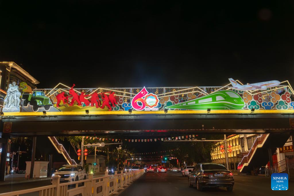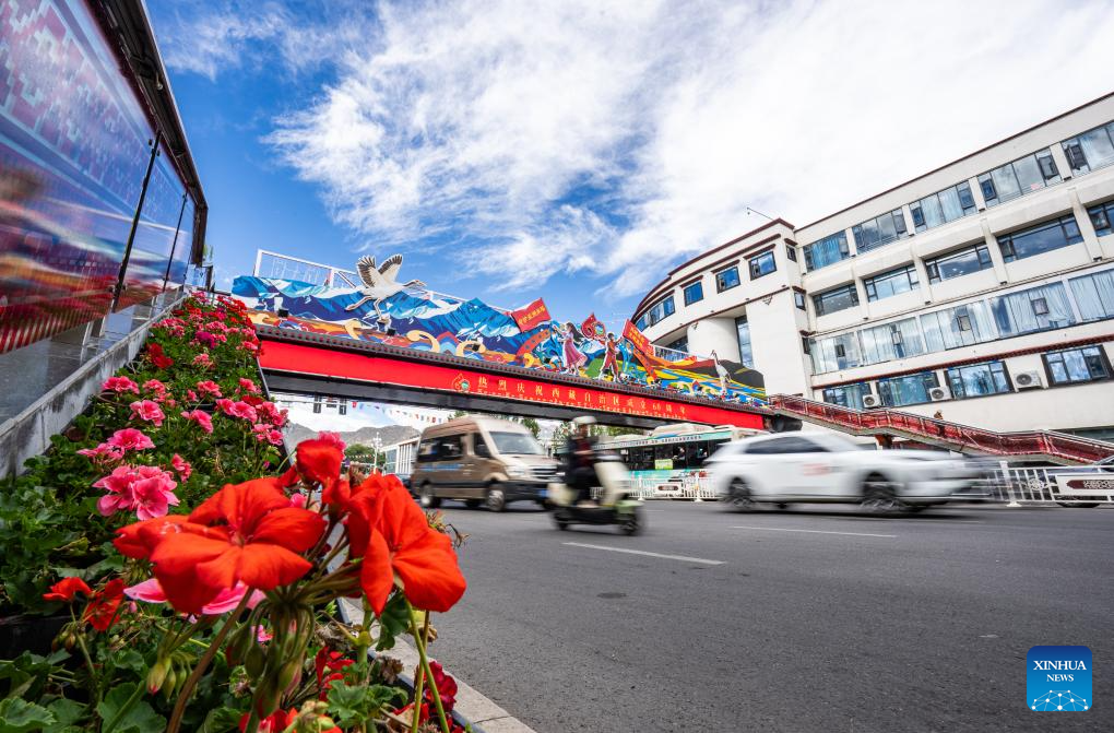 This photo taken on Aug. 19, 2025 shows a street view in Lhasa, southwest China's Xizang Autonomous Region. The streets of Lhasa are adorned with lanterns and decorations in celebration of the 60th founding anniversary of Xizang Autonomous Region. (Xinhua/Tenzin Nyida)
