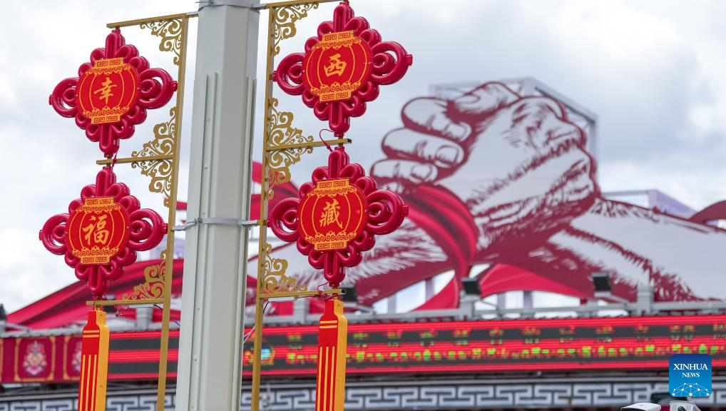 This photo taken on Aug. 19, 2025 shows decorations on a street in Lhasa, southwest China's Xizang Autonomous Region. The streets of Lhasa are adorned with lanterns and decorations in celebration of the 60th founding anniversary of Xizang Autonomous Region. (Xinhua/Tenzing Nima Qadhup)