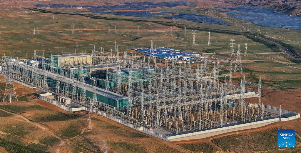 An aerial drone photo taken on Aug. 20, 2025 shows the Zhongning converter station, the sending end of the Ningxia-Hunan ±800 kV ultra-high voltage (UHV) direct current transmission project in Zhongwei City, northwest China's Ningxia Hui Autonomous Region. The Ningxia-Hunan ±800 kV UHV direct current transmission project, which brings electricity from northwest China's Ningxia Hui Autonomous Region to central China's Hunan Province, was put into operation for power transmission on Wednesday.