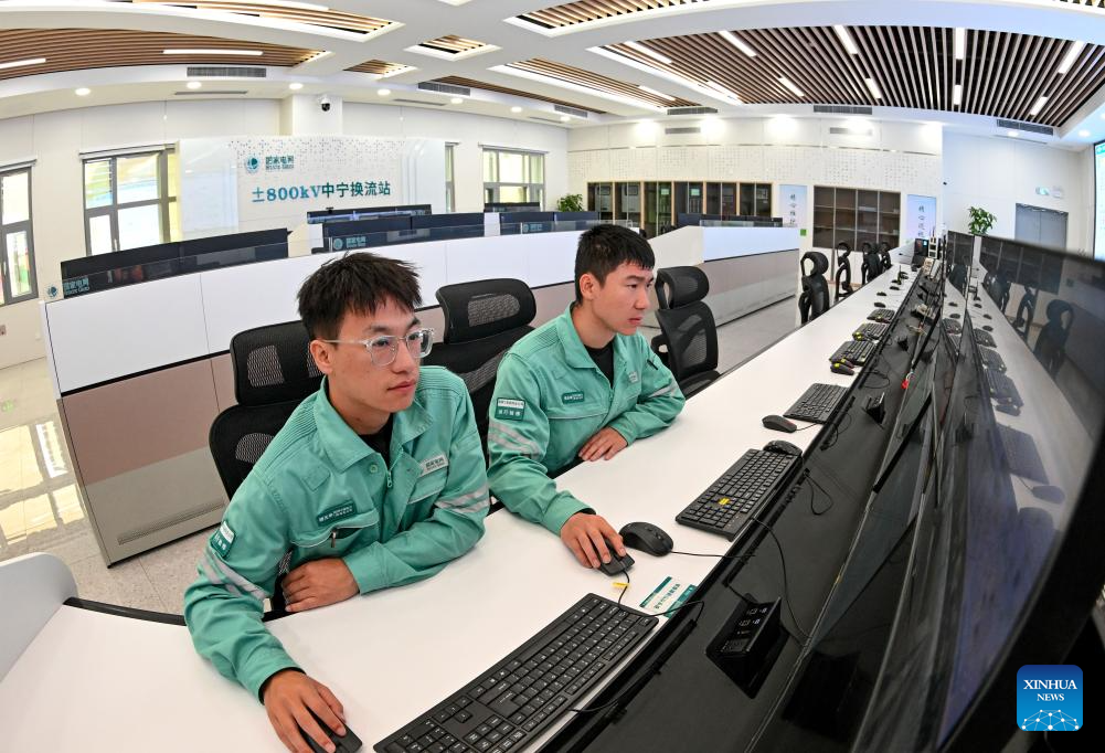 Operation and maintenance personnel monitor the operation of equipment in the main control room of the Zhongning converter station, the sending end of the Ningxia-Hunan ±800 kV ultra-high voltage (UHV) direct current transmission project in Zhongwei City, northwest China's Ningxia Hui Autonomous Region, Aug. 20, 2025. The Ningxia-Hunan ±800 kV UHV direct current transmission project, which brings electricity from northwest China's Ningxia Hui Autonomous Region to central China's Hunan Province, was put into operation for power transmission on Wednesday.