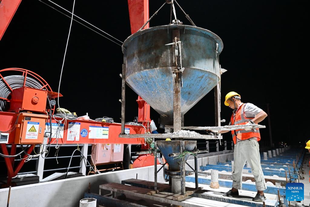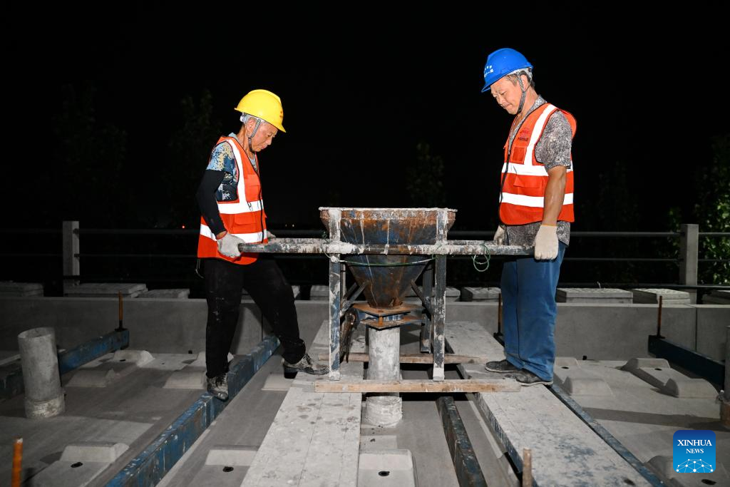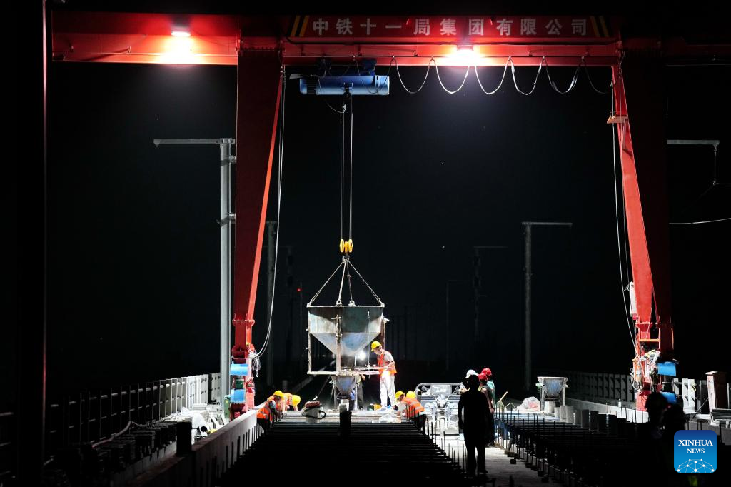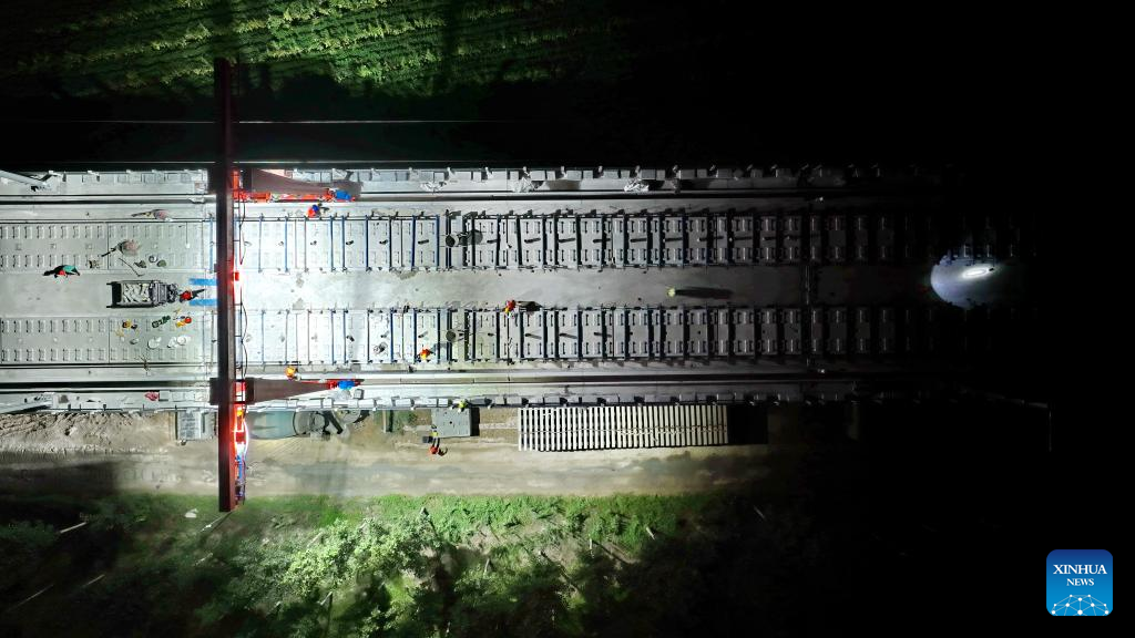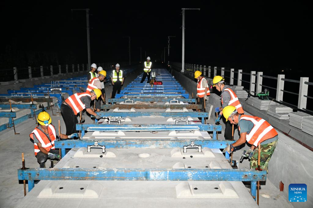 Workers are pictured during track-laying operation at the construction site of the Hebei section of the Xiong'an-Shangqiu high-speed railway in north China's Hebei Province, Aug. 20, 2025.