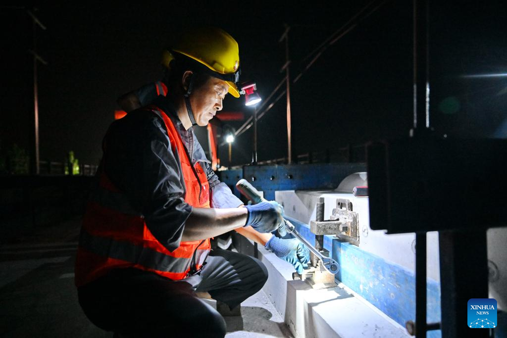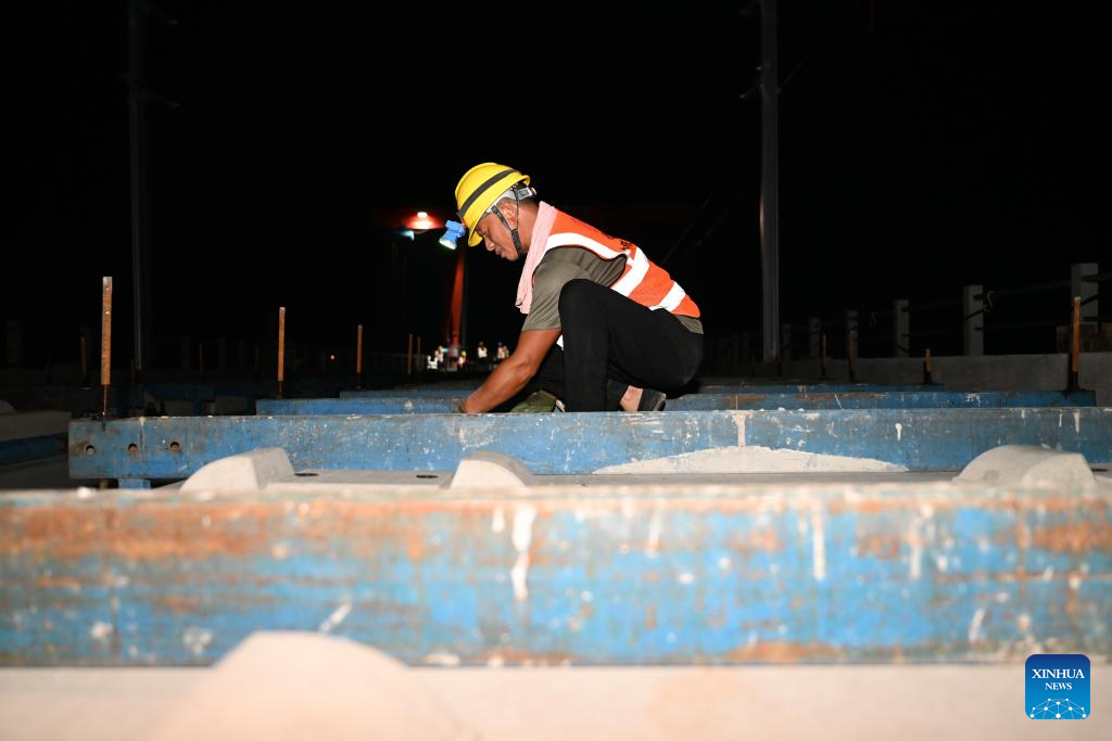 A worker is busy laying tracks at the construction site of the Hebei section of the Xiong'an-Shangqiu high-speed railway in north China's Hebei Province, Aug. 20, 2025.