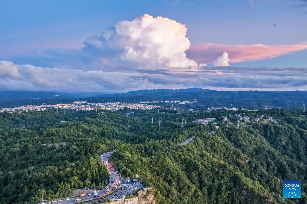 An aerial drone photo shows tourists watching the sunset at an observation platform in Huangshui Town of Shizhu County, southwest China's Chongqing Municipality, Aug. 20, 2025. Huangshui has turned itself into a well noted tourist destination by taking full advantage of local forest and landscape resources. So far this year, the town has received 16 million visitors, who brought in a combined revenue of 11.2 billion yuan (1.56 billion U.S. dollars). (Xinhua/Tang Yi)