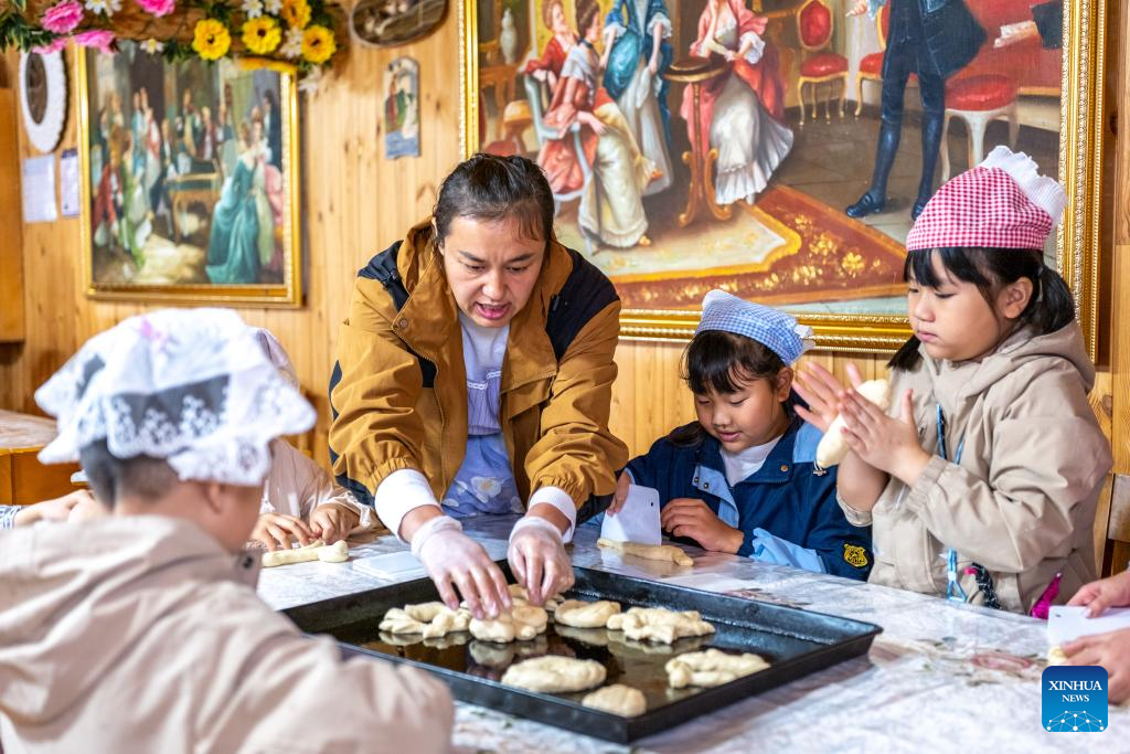Children learn to make Russian bread at Enhe Township of Hulun Buir, north China's Inner Mongolia Autonomous Region, on Aug. 21, 2025. Enhe, located in the northeastern corner of Inner Mongolia, is China's only Russian ethnic township that has for years drawn travelers seeking its inspiring blend of Chinese-Russian culture, hearty cuisine and sweeping natural vistas.