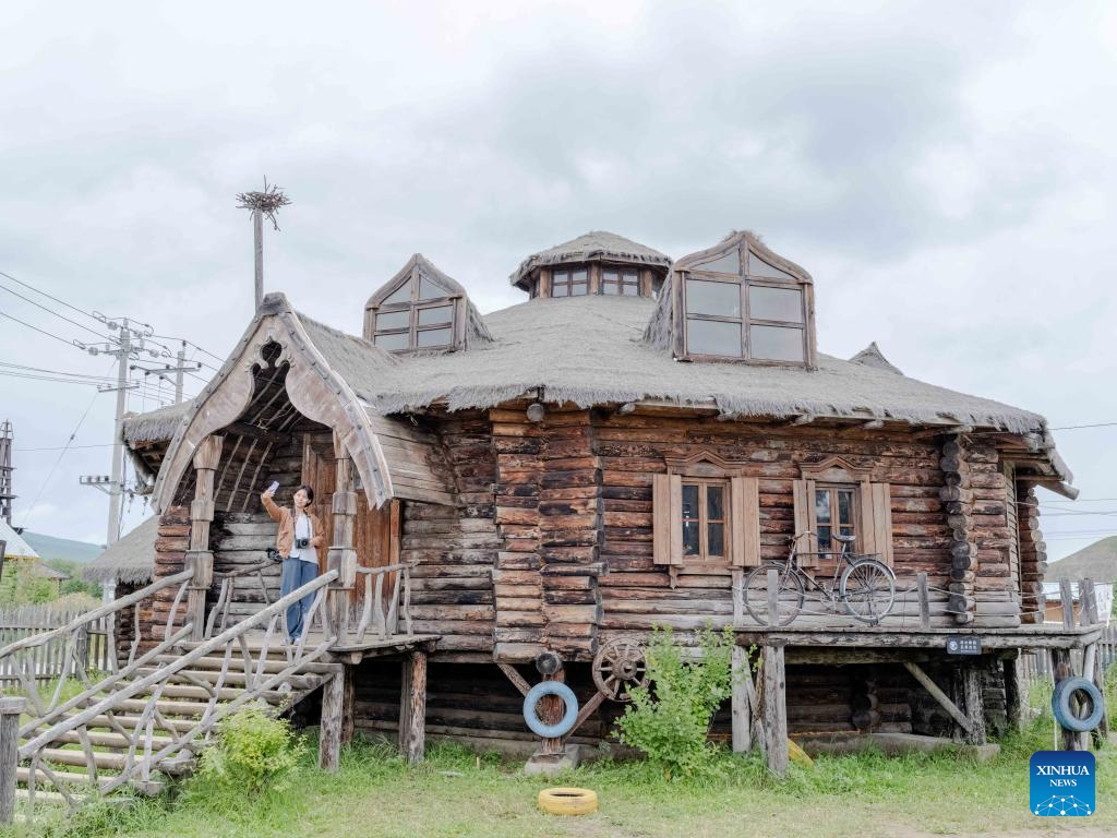 Tourists take photos in front of a distinctive Russian-style wooden house at Enhe Township of Hulun Buir, north China's Inner Mongolia Autonomous Region, on Aug. 21, 2025. Enhe, located in the northeastern corner of Inner Mongolia, is China's only Russian ethnic township that has for years drawn travelers seeking its inspiring blend of Chinese-Russian culture, hearty cuisine and sweeping natural vistas.