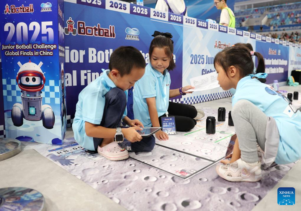 Participants from Austria (L) compete during the 2025 Junior Botball Challenge Global Finals in China in Beijing, capital of China, Aug. 21, 2025. The 2025 Junior Botball Challenge Global Finals in China kicked off on Thursday at the National Speed Skating Oval in Beijing. Nearly 1,500 young science and technology enthusiasts from more than ten countries and regions, including China, the United States, Malaysia, Thailand, Austria, and Slovakia, participated in the event. (Xinhua/Zhang Chenlin)