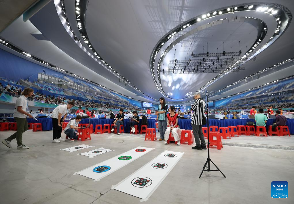 Participants compete during the 2025 Junior Botball Challenge Global Finals in China in Beijing, capital of China, Aug. 21, 2025. The 2025 Junior Botball Challenge Global Finals in China kicked off on Thursday at the National Speed Skating Oval in Beijing. Nearly 1,500 young science and technology enthusiasts from more than ten countries and regions, including China, the United States, Malaysia, Thailand, Austria, and Slovakia, participated in the event. (Xinhua/Zhang Chenlin)