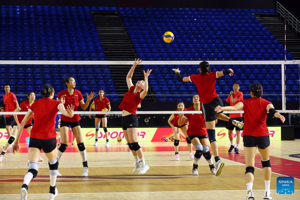 Players of team China take part in a training session ahead of the FIVB Women's Volleyball World Championship in Chiang Mai, Thailand, Aug. 21, 2025. (Xinhua/Hou Zhaokang)