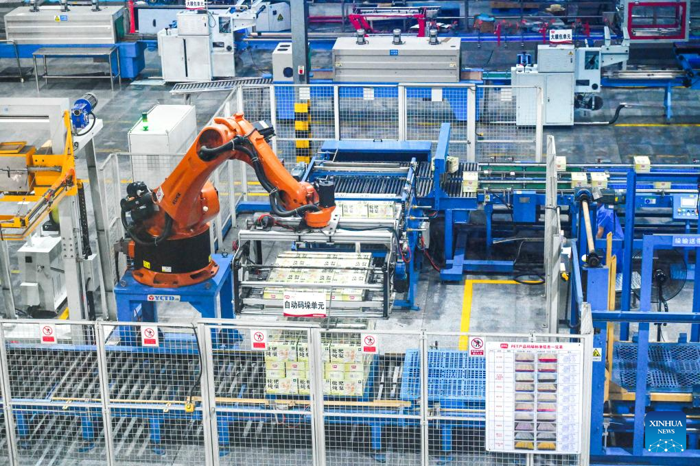 This photo taken on Aug. 19, 2025 shows a smart production line at the workshop of Panpan Foods in Jinjiang, southeast China's Fujian Province. (Xinhua/Lin Shanchuan)