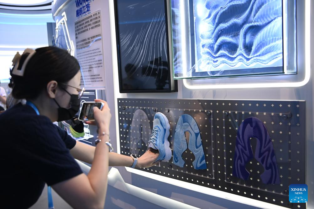 A visitor takes photos of an exhibit at SinceTech, a shoe material textile company, in Jinjiang, southeast China's Fujian Province, Aug. 20, 2025. (Xinhua/Xiao Xiao)