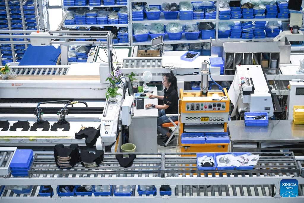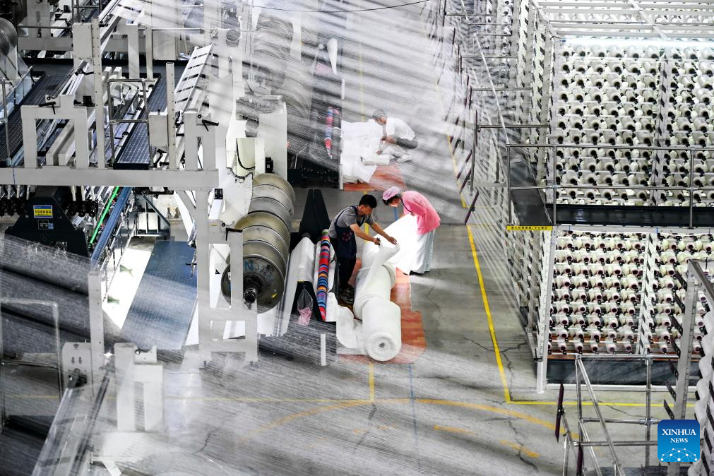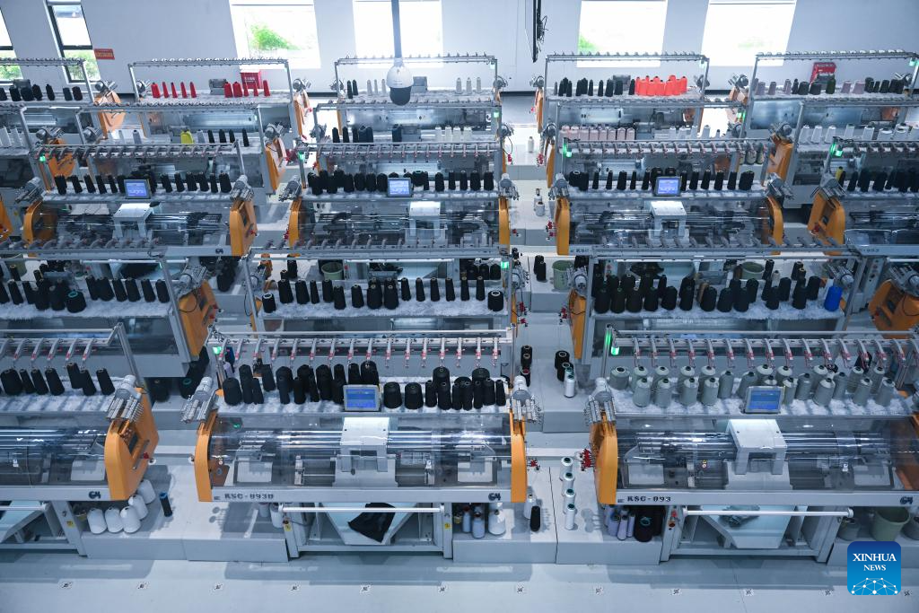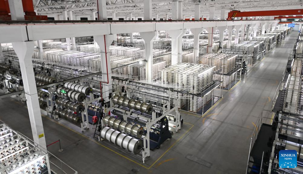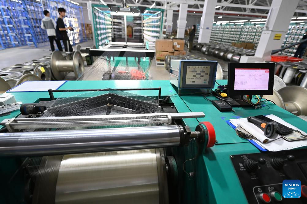 This photo taken on Aug. 20, 2025 shows a scene at the smart workshop of SinceTech, a shoe material textile company, in Jinjiang, southeast China's Fujian Province. (Xinhua/Xiao Xiao)