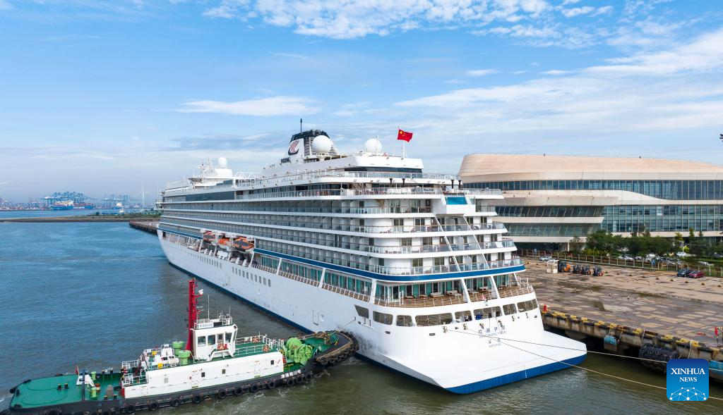 Cruise ship Zhao Shang Yi Dun docks at the Tianjin International Cruise Home Port in Tianjin, north China, Aug. 22, 2025. The cruise ship Zhao Shang Yi Dun arrived in Tianjin for the first time on Friday since commencing official operations. (Xinhua/Zhao Zishuo)