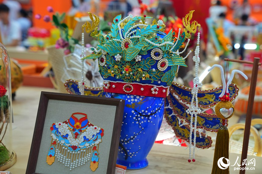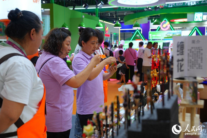 Visitors admire exquisite handicrafts at the ongoing 24th China Changchun International Agriculture and Food Expo (Trade) in Changchun, northeast China's Jilin Province. (People's Daily Online/Li Yang)