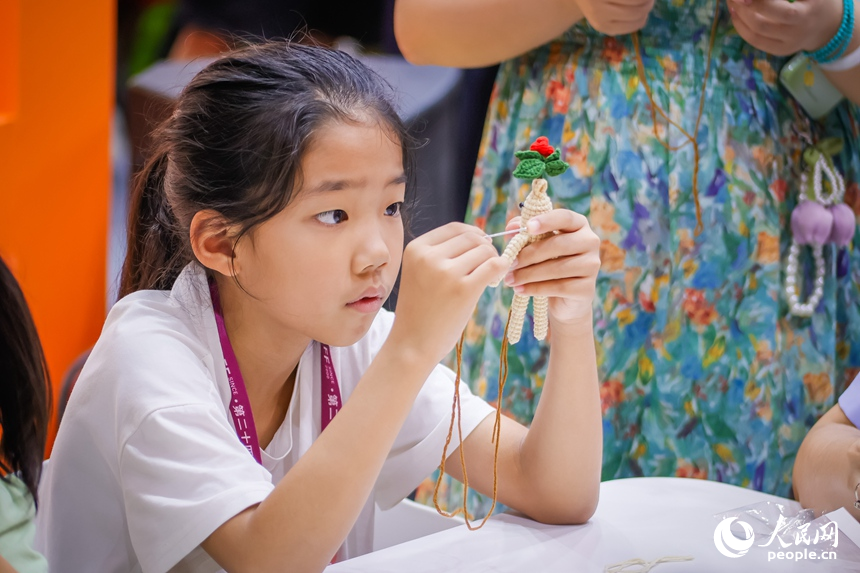 A girl learns to make a handicraft at the ongoing 24th China Changchun International Agriculture and Food Expo (Trade) in Changchun, northeast China's Jilin Province. (People's Daily Online/Li Yang)